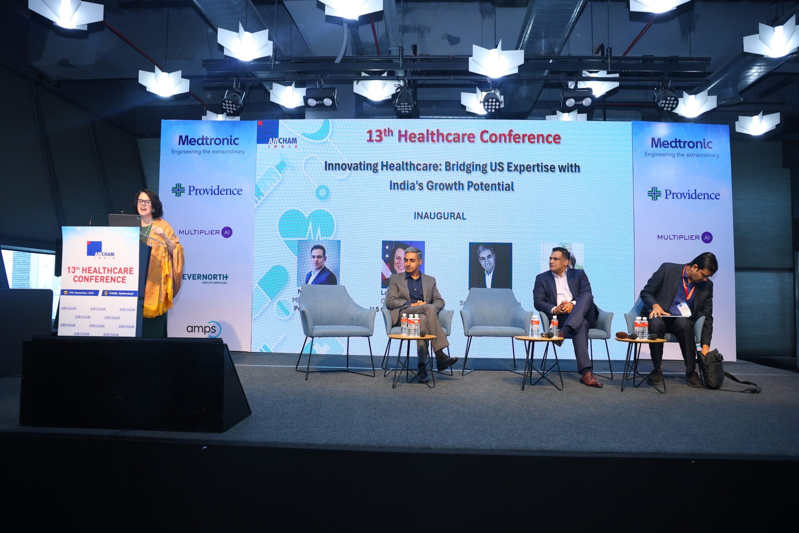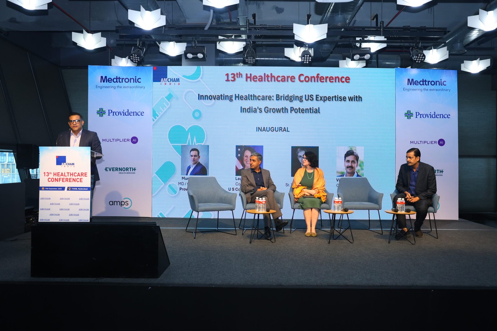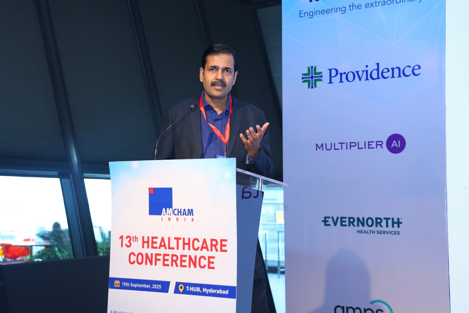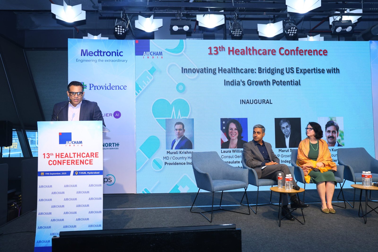 AMCHAM’s 13th Healthcare Conference was held on September 19th , 2025, at T-Hub in Hyderabad. In the inaugural session Mr. Murali Krishna, Co-Chairman – Hyderabad Chapter, AMCHAM and Country Head, Providence India, highlighted that the U.S. healthcare industry is at a pivotal point — globally recognized for excellence but facing major headwinds like workforce shortages, burnout, and uneven adoption of technology. Key themes included: