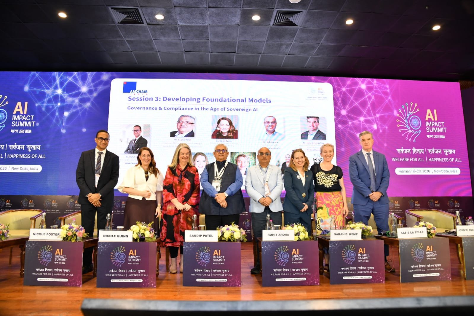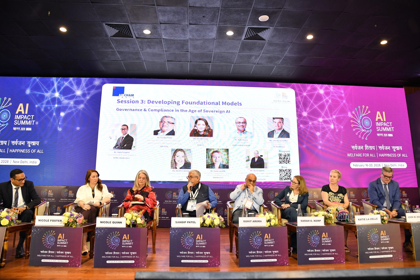 The third and final session, ‘Governance & Compliance in the Age of Sovereign AI,’ was moderated by Mr. Rahul Singhal, Partner & Head of Cyber Assurance, KPMG, and featured Mr. Sandip Patel, Chairman, AMCHAM and General Manager, India/South Asia and Managing Director, IBM India, Ms. Nicole Foster, Director of AWS Global AI and Canada Public Policy, Amazon, Mr. Rohit Arora, Co-Founder & CEO, Biz2Credit and Biz2X, Mr. John W. Schaeffler, Executive Director, Government Affairs & Policy, GE Healthcare, Ms. Sarah E. Kemp, Vice President, International Government Affairs, Intel, Ms. Katie La Zelle, Vice President Global Engagement – Privacy, AI and Data Responsibility, Mastercard, and Ms. Nicole Quinn, Vice President for Policy and Government Affairs, Japan and Asia Pacific, Palo Alto Networks. The panel addressed the legal, regulatory, and security architecture underpinning sovereign AI, with discussions spanning DPDP Act compliance, algorithmic accountability, explainability of indigenous LLMs, AI agent identity and access management, and the importance of cross-border data flows for financial fraud prevention. Speakers converged on the view that sovereign AI is not about isolation but about building trustworthy, accountable, and globally collaborative AI systems rooted in the Indian context.