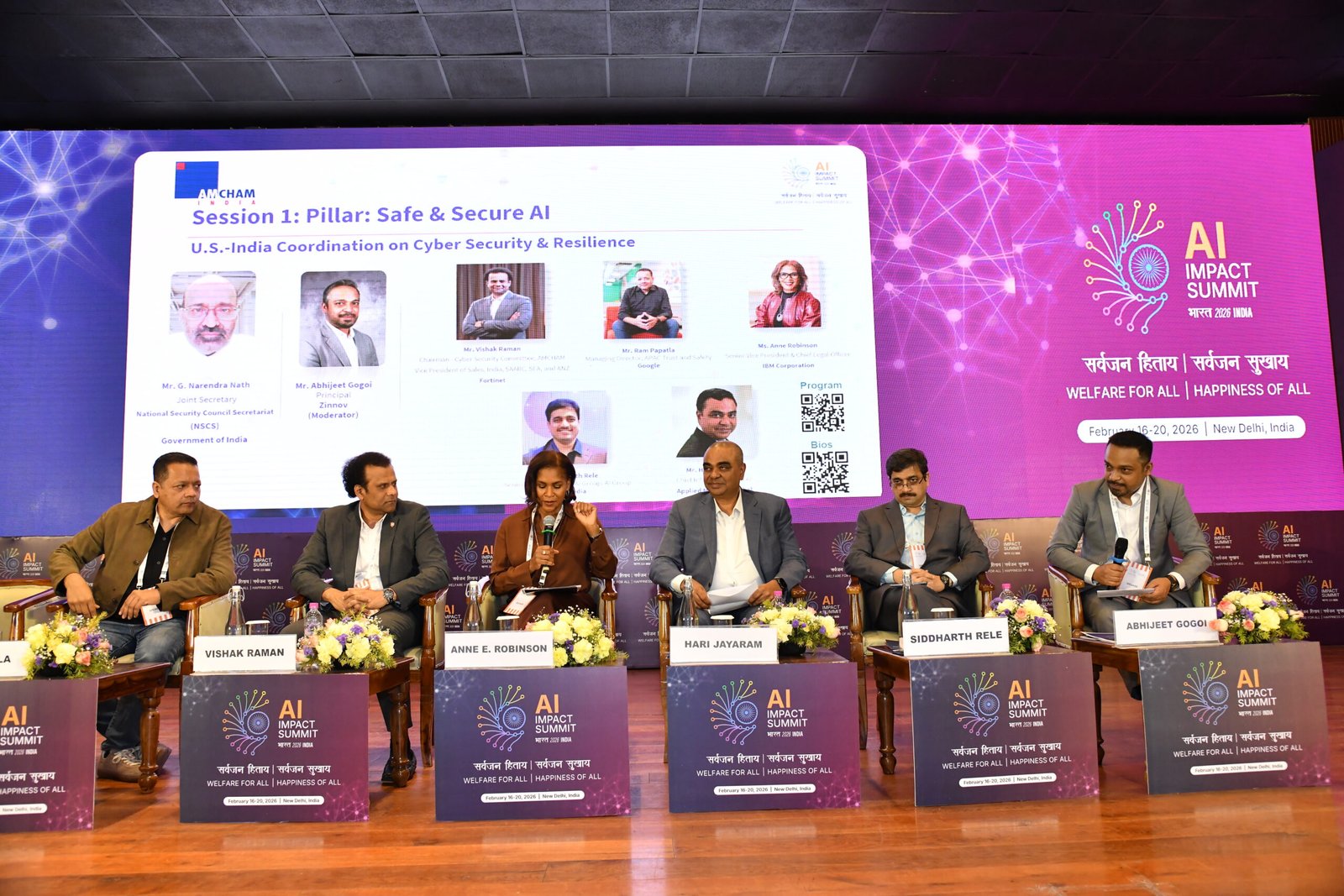 The first session, ‘U.S.-India Coordination on Cyber Security & Resilience,’ was moderated by Mr. Abhijeet Gogoi, Principal, Zinnov, and featured Mr. Vishak Raman, Chairman – Cyber Security Committee, AMCHAM and Vice President of Sales, India, SAARC, SEA and ANZ, Fortinet, Mr. Hari Jayaram, Chief Information Officer, Applied Material Global, Mr. Siddharth Rele, Senior Director for the AI Group, AMD India, Mr. Ram Papatla, Managing Director, APAC Trust and Safety, Google, and Ms. Anne E. Robinson, Senior Vice President & Chief Legal Officer, IBM. A special address was delivered by Mr. G. Narendra Nath, Joint Secretary, National Security Council Secretariat (NSCS), Government of India. The panel explored how AI is transforming both cyber threat landscapes and defence capabilities, with speakers emphasising security-by-design principles, federated infrastructure, responsible AI, and the need for transparency in training data provenance. Mr. Narendra Nath called on industry to cooperate with government in establishing the provenance of AI training data, a prerequisite for trustworthy national AI systems.